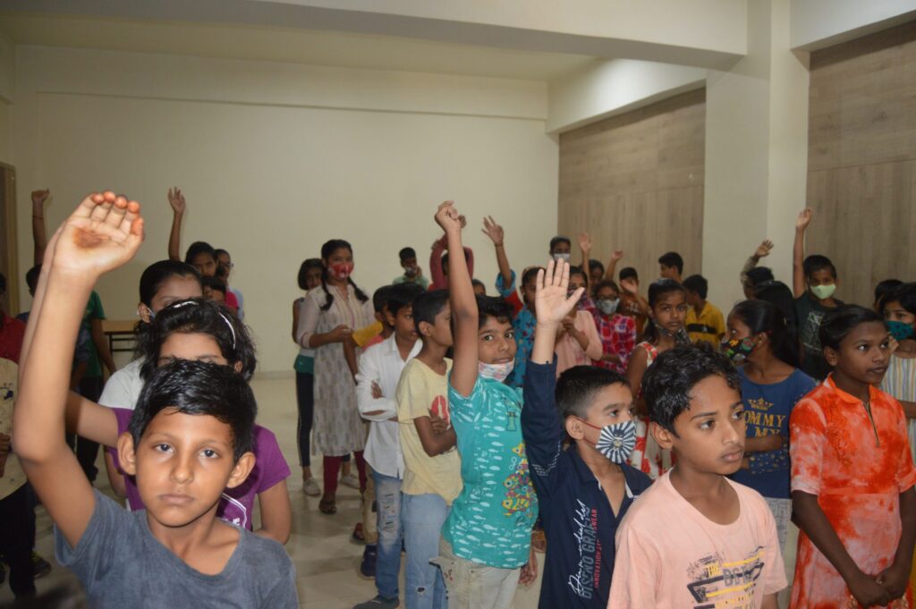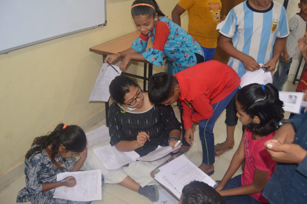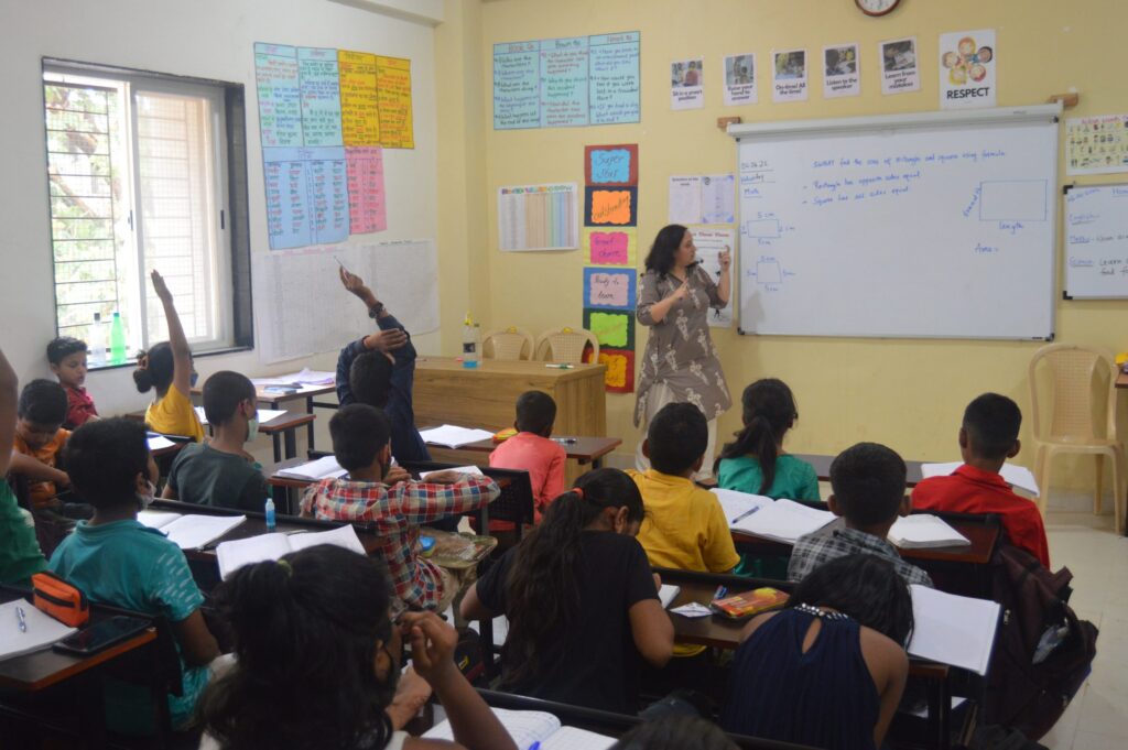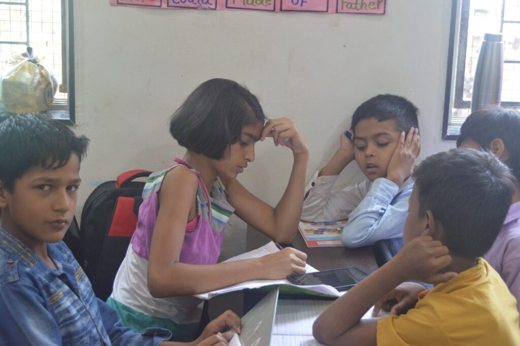 They together serve 160 students in Grades 5 and 6. The students belong to families with parents mostly working as daily wage earners and factory workers, with the family income between Rs. 5000-10000 per month. When the school started in 2021, the community was severely hit by the pandemic. Several students at SAV were earlier studying in private schools earlier but could not continue to afford the fees. One fifth of the student families were without any source of income. 50% of the students had travelled back to their villages. When the admissions were finally over and learning began, the team found out, expectedly, that with a lack of continued learning opportunities [due to the lockdown], about 60% of students were 5 to 6 years behind their grade levels. Also, the school building was also not completely constructed – the government funding had to be diverted to COVID-19 relief – with only a single hall available to conduct classes.