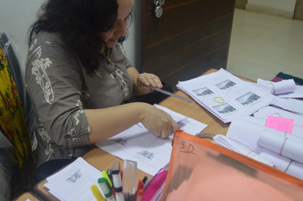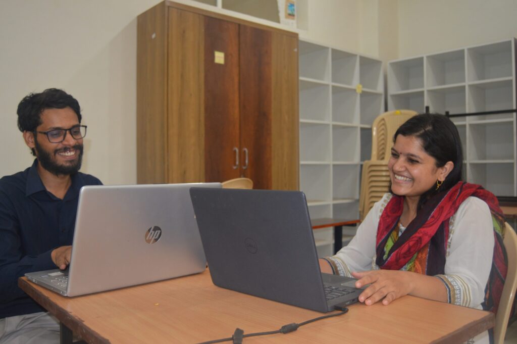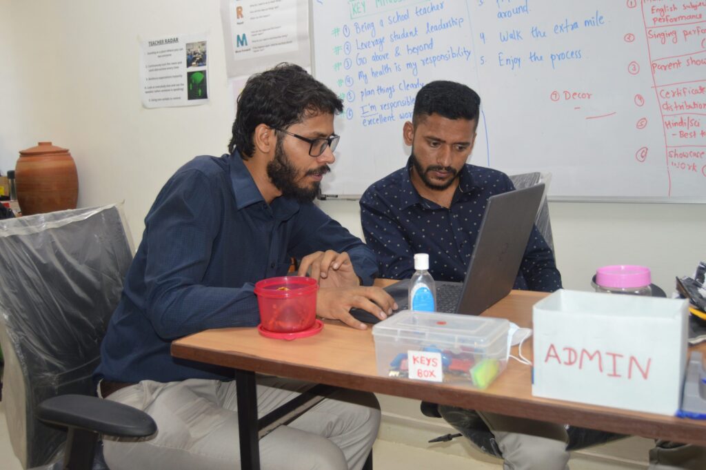 As the learning commences in the classroom, the small staff room is abreast with activity. The room is small, if not miniscule. Availability of space is always a challenge in PPP and Affordable Private Schools – classrooms are a priority and the staff has to make do with what is available. Here, Ankit spends time with Rameshwar, the Admin Associate, to run through the school management tracker and how the gaps need to be filled.